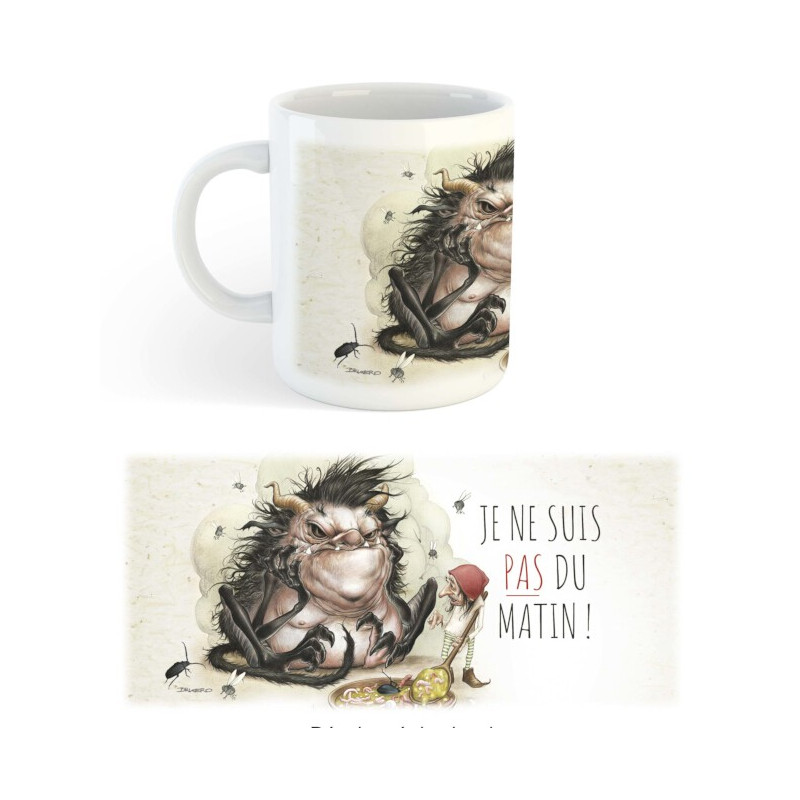 Ce mug original est décoré d'une étrange et repoussante créature face à un petit lutin apeuré, et porte la mention « Je ne suis pas du matin ! ». Il est illustré par l'artiste Brucero (Druiz, la prophétie perdue de Pascal Lamour)